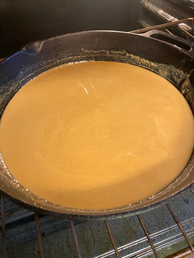 Preheat oven to 350 degrees. Combine ingredients in a cast iron skillet and whisk into a liquidy paste. Place in oven and set a time for 30 minutes.
