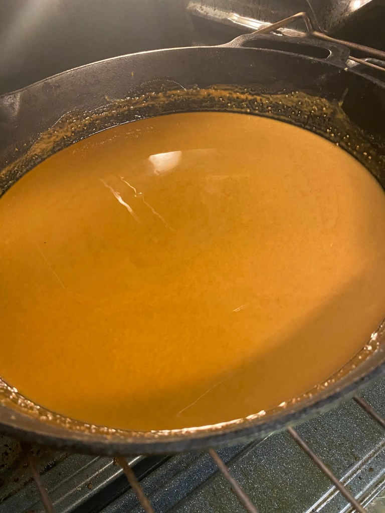Once your timer goes off after 30 minutes, stir the roux. This is a Blonde Roux and can be used for many things. We’re cooking Cajun food tonight, so we need DARK. Use it at this point or keep on keepin on for something darker. This is what it should look like: