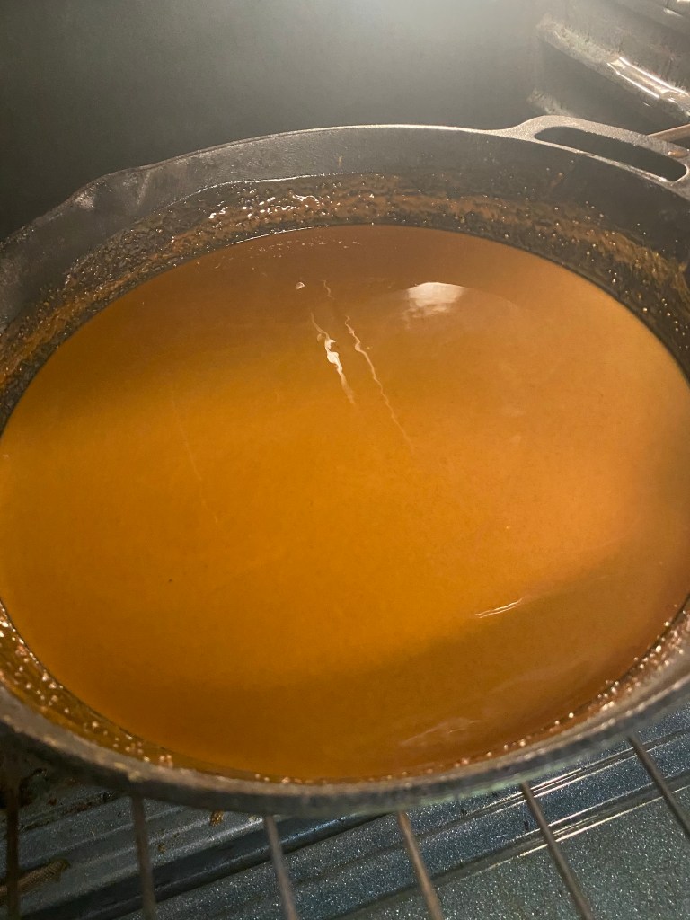 When the timer goes off (60 minutes total now) repeat the process of stirring and check the color. This is a bit darker, but not as dark as I need for what I’m making. So, I’m gonna keep going and set another 30 minute timer.